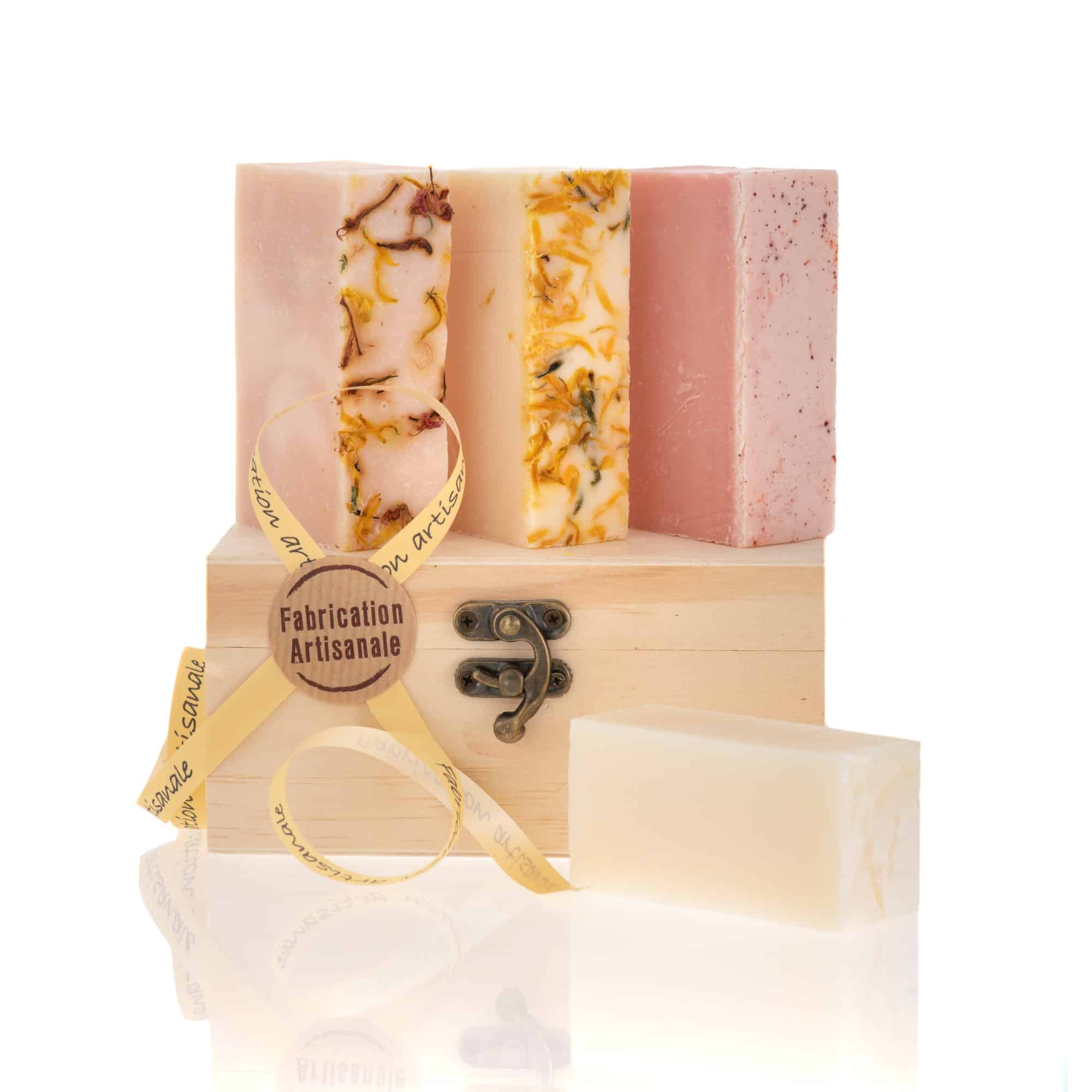 Coffret en bois garni de quatre Savons Bio issus de l’artisanat.